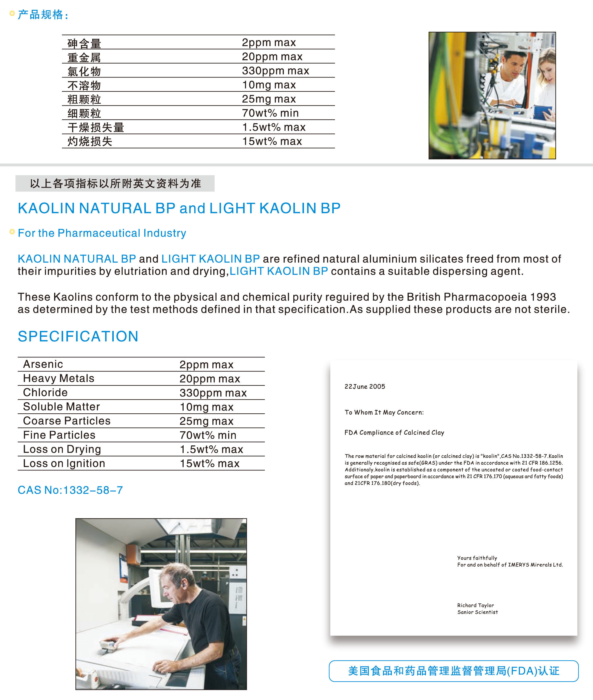 Light Kaolin BP出産(chǎn)于澳大利亞,在(zai)淘洗和幹燥過(guo)程中去除它們(men)的雜👉質後,具有(yǒu)很純特性和适(shi)當的分散性,産(chan)品産🈚地賦予極(jí)其微的鉛💃🏻、汞、砷(shēn)含量。 Light Kaolin BP符合人體(tǐ)健康要求,嚴格(gé)按照英國藥典(diǎn)1993法定測試規格(ge)執行。